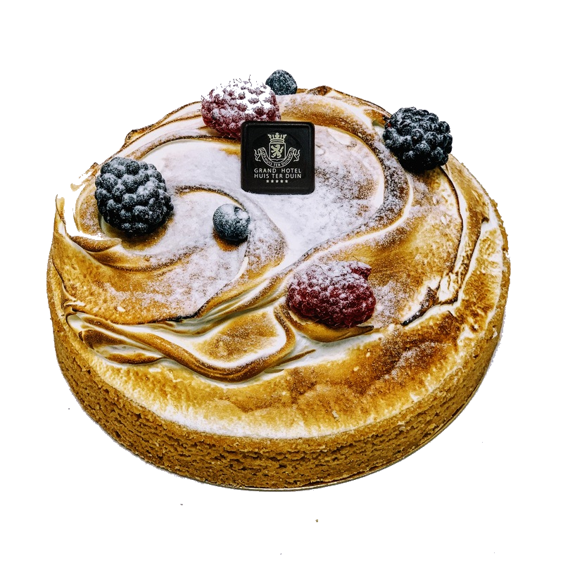 Frisse citroen yoghurt mousse, een roomboter sloffenbodem en afgebrande meringue. Van deze taart kunnen 6 tot 8 personen van genieten.